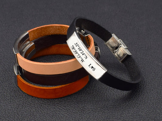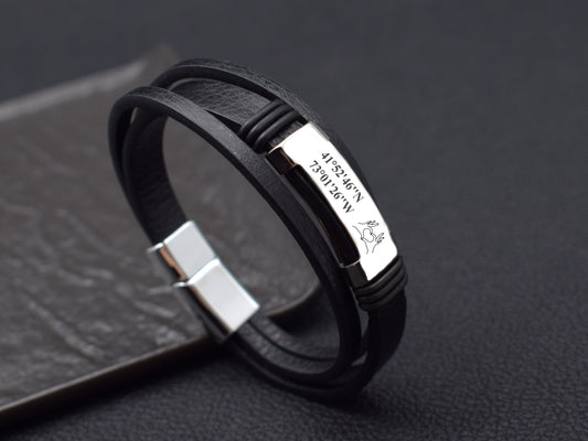 Leather bracelet with engraved coordinates GPS latitude longitude gifts