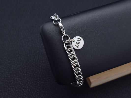 Custom chain bracelets for men. Can be personalized with initial, couples initials, name, important date, letter, coordinates. Bracelets are available with different types of links - figaro chain, curb chain, cuban chain, chunky chain. Men's link chain bracelet made of high-quality material - stainless steel. Customizble bracelet is a thoughtful gift for men for any occasion. Whether it's a first anniversary or a boyfriend's birthday, Father's Day or Family Day, St. Valentine's Day or Christmas.