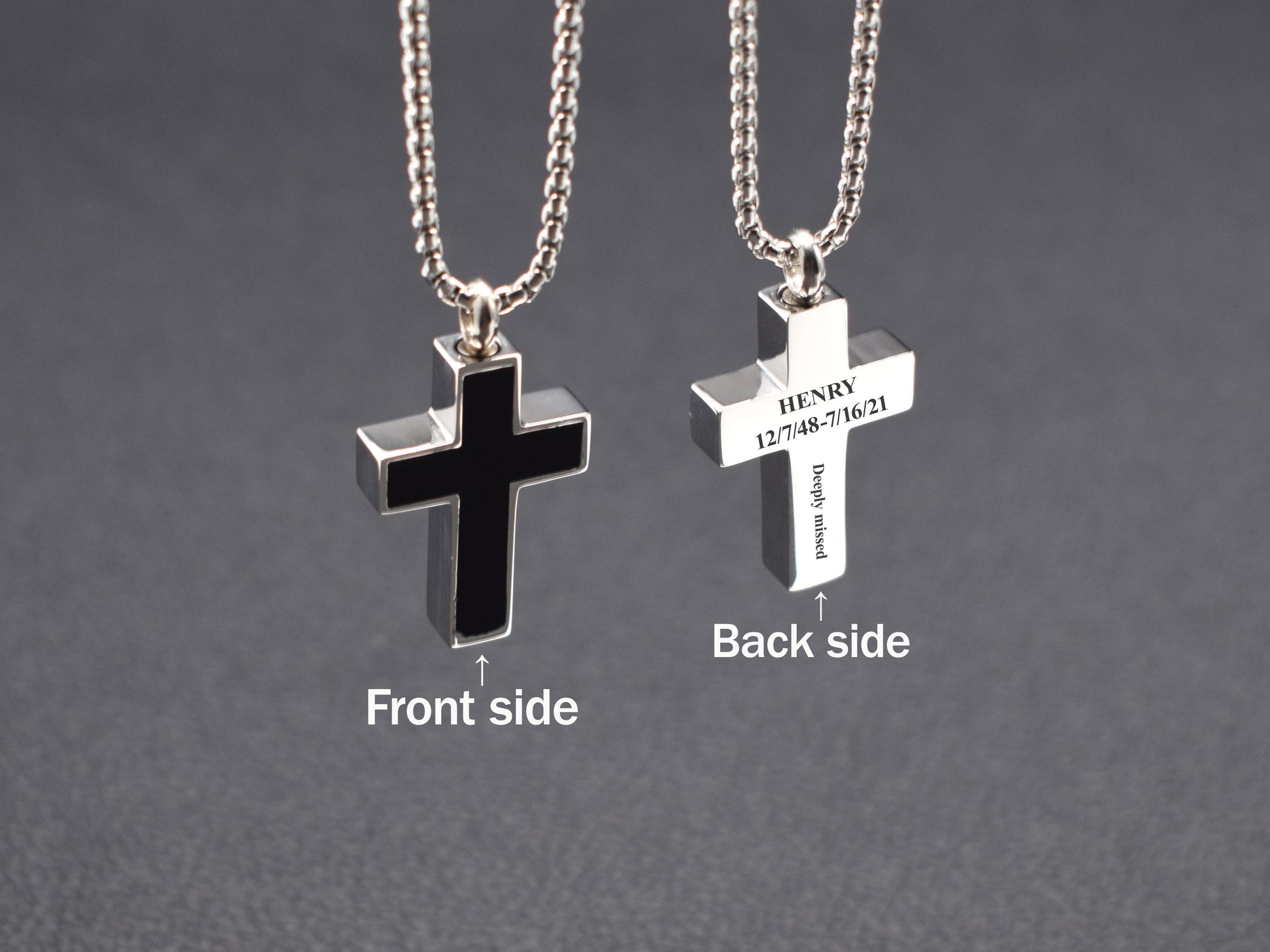 This men's cross necklace is memorial necklace for ashes. Can be personalized with name, custom date, an important phrase of your choice ( Always in my heart, In loving memory, Forever remembered, Gone but not forgotten, Rest in peace, Fondly remembered, Forever in our hearts, Eternal love, Cherished in our memories, Deeply missed etc.)