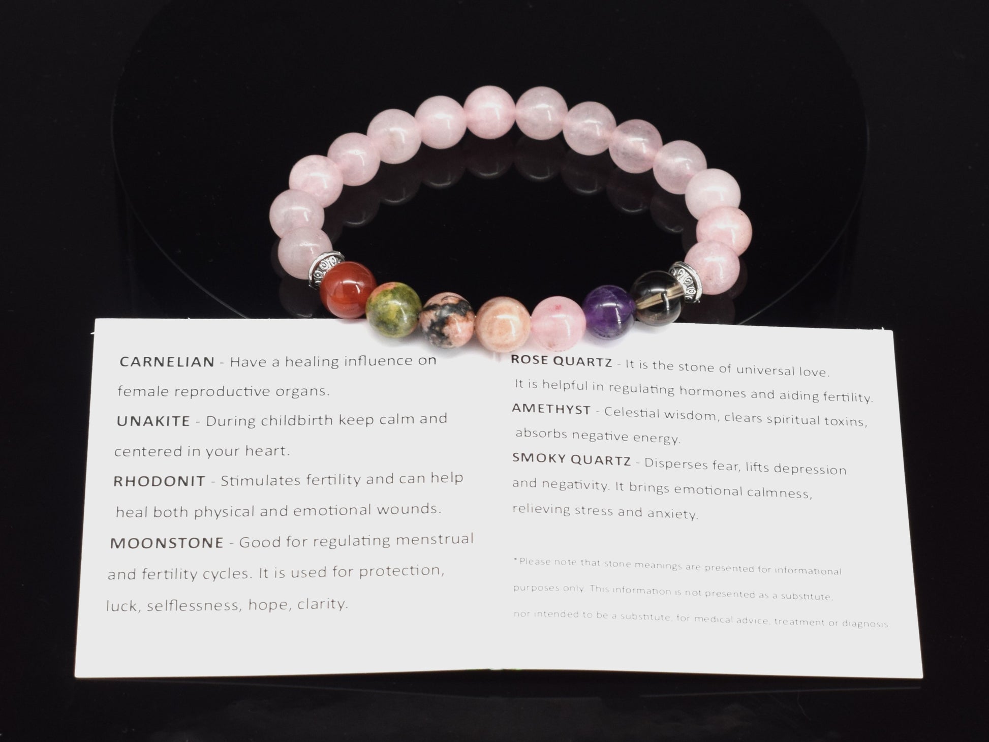 - 7 fertility stones: Carnelian, Unakite, Rhodonite, Moonstone, Rose quartz, Amethyst, Smoky Quartz.