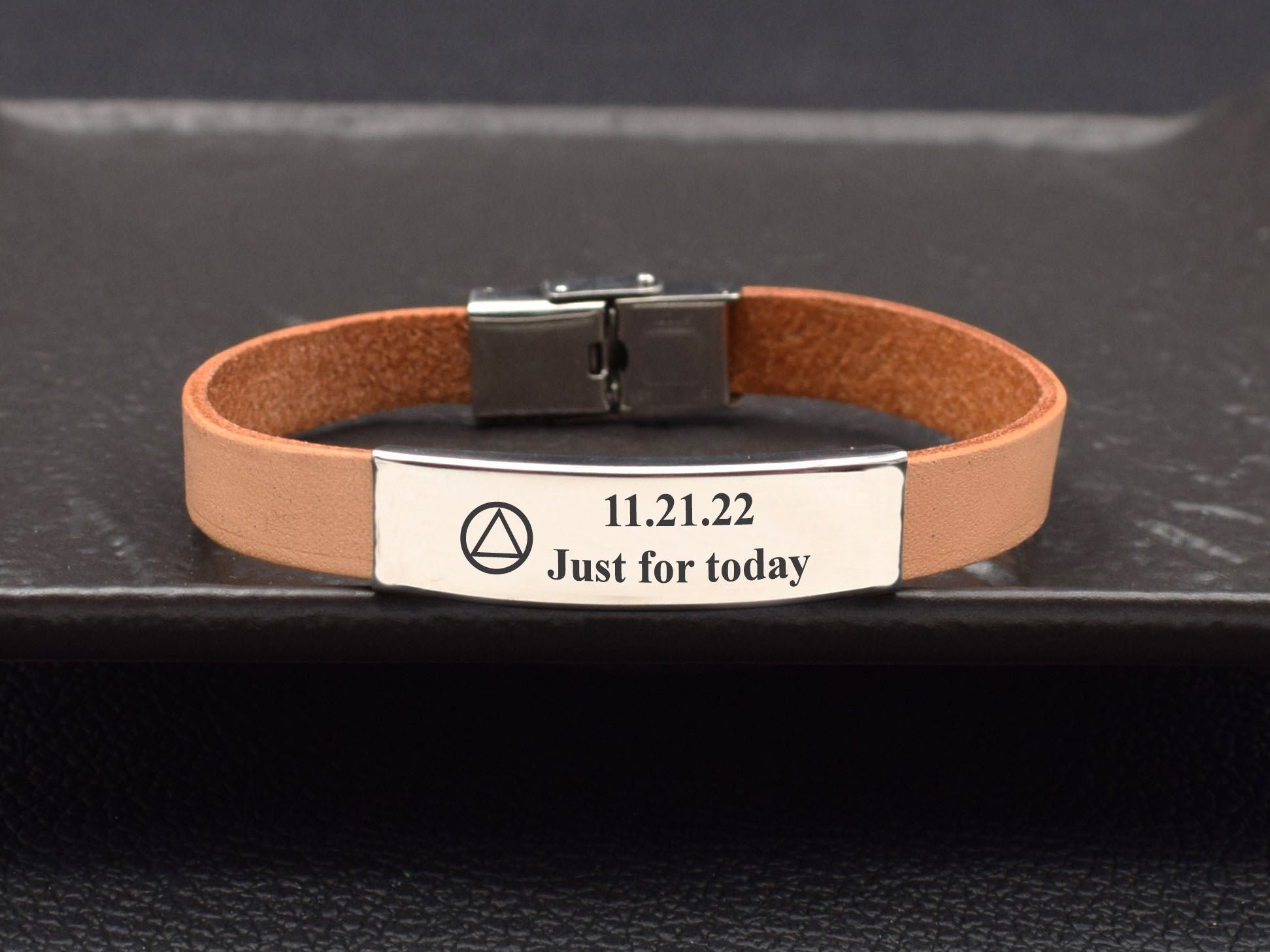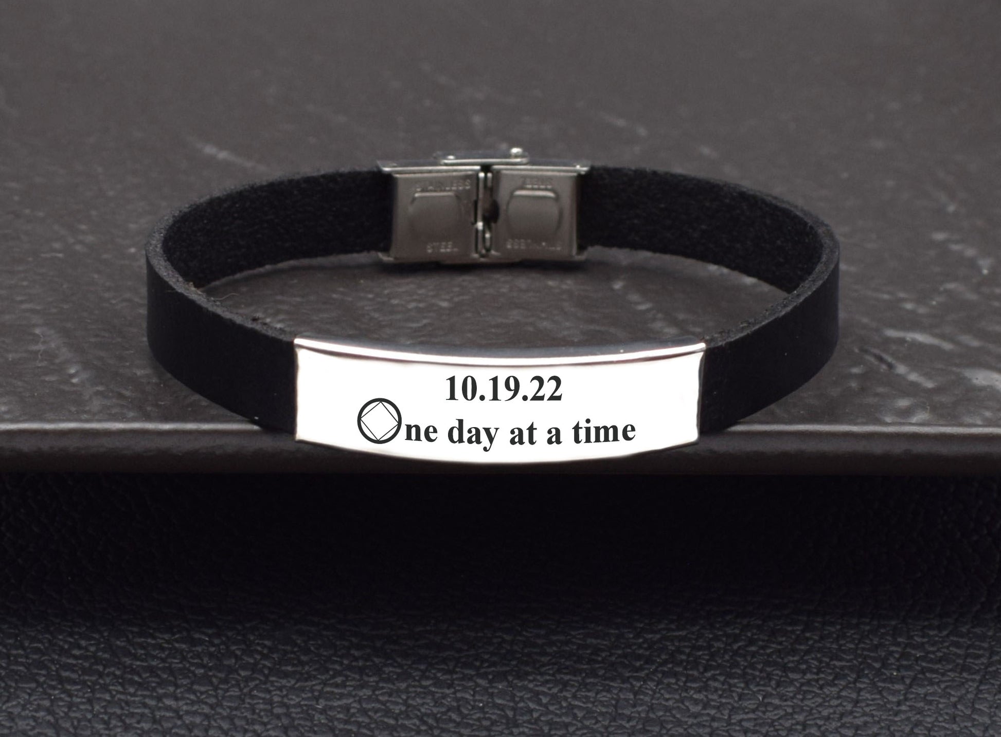 Unique leather sobriety bracelet is the perfect personalized sober gift with sobriety date and a phrase of support (one day at a time, one day at a fucking time, just for today, never give up, i believe in you, stay strong etc.). Customize your sober bracelet however you like.