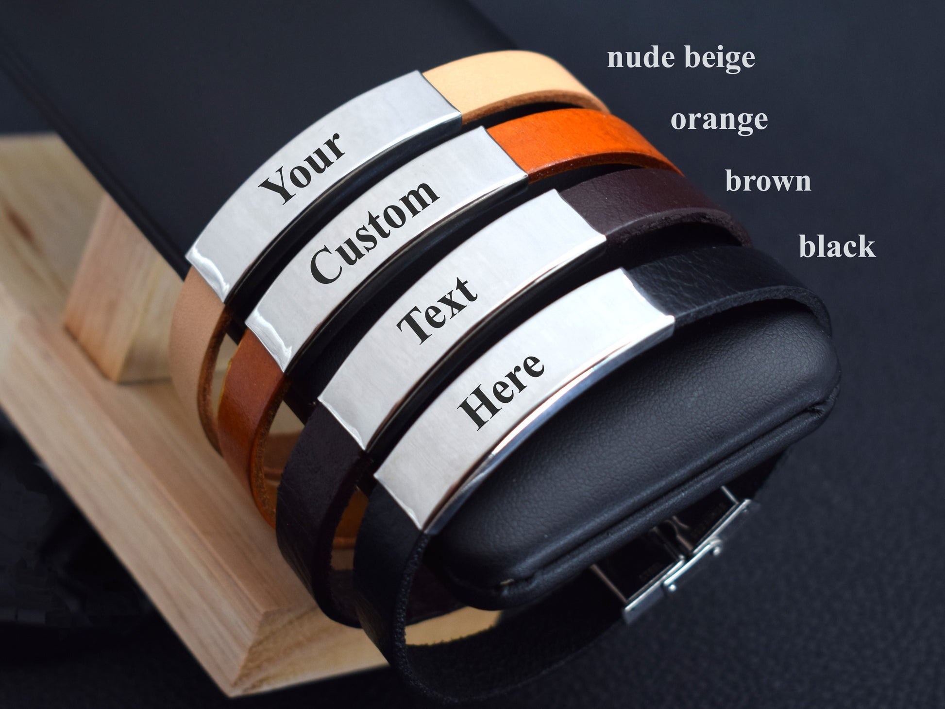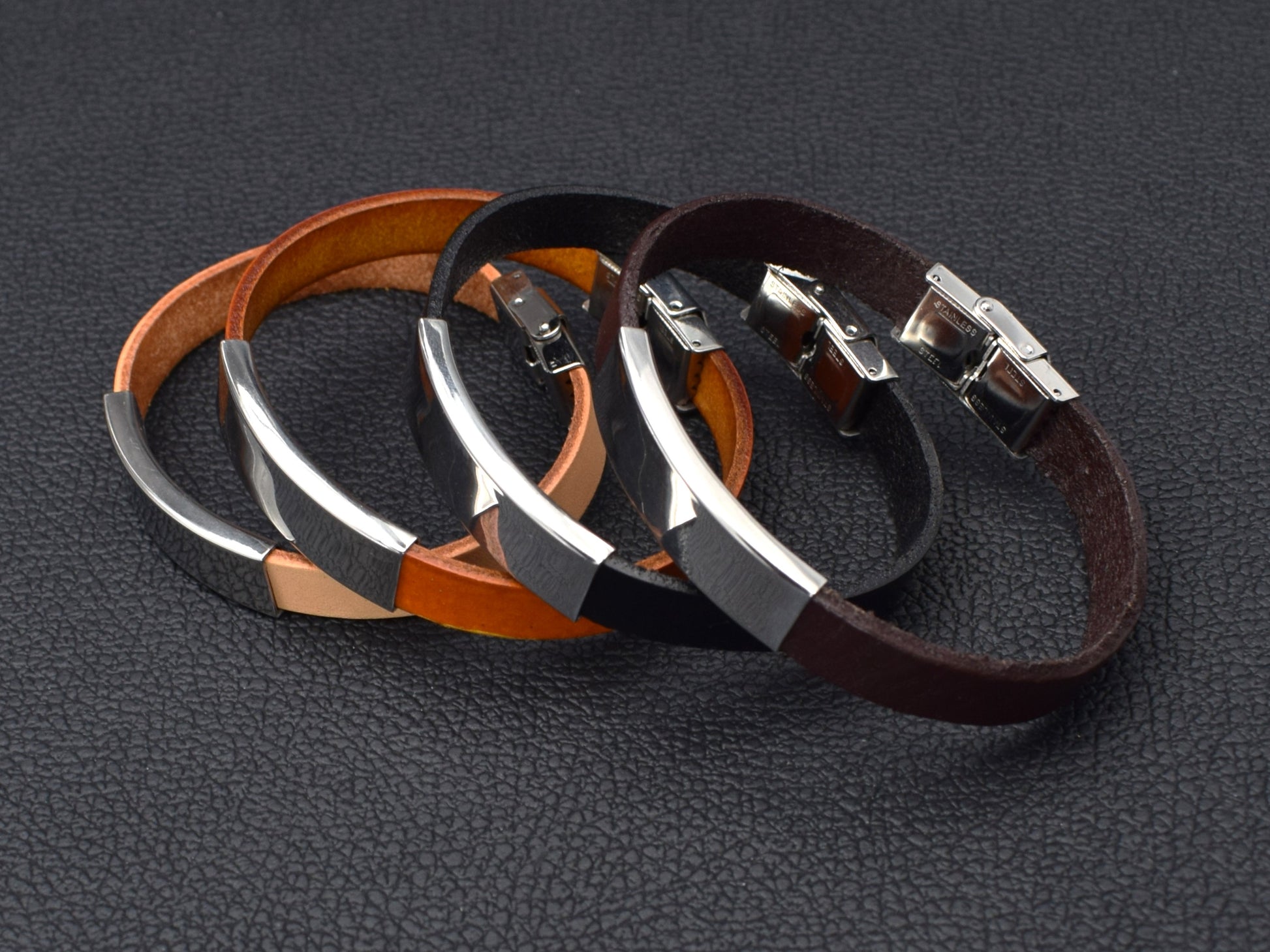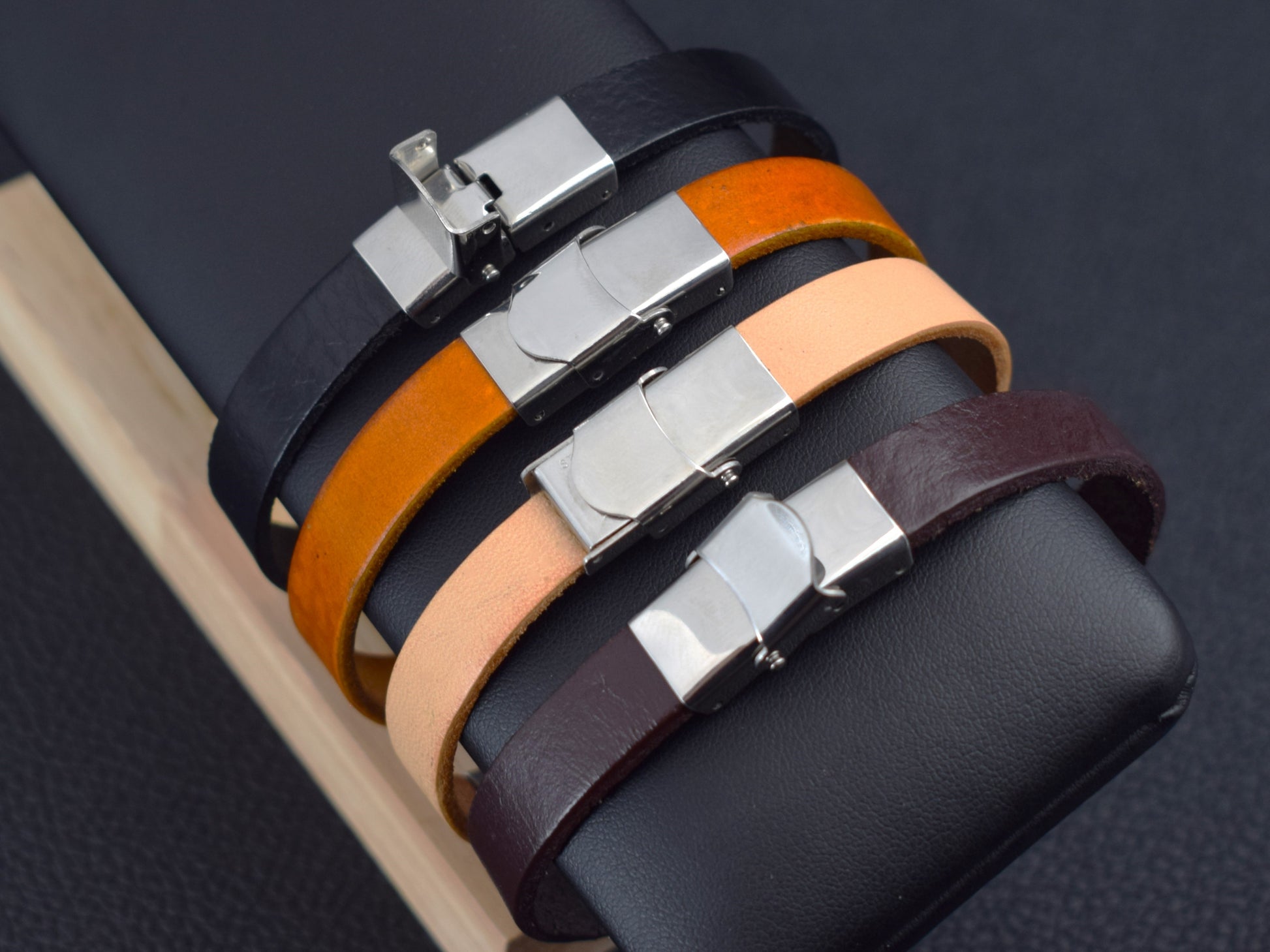 Available in different bracelet sizes from 6.5 inches to 9 inches and 4 leather colors ( black leather, brown leather, orange leather and nude beige leather)