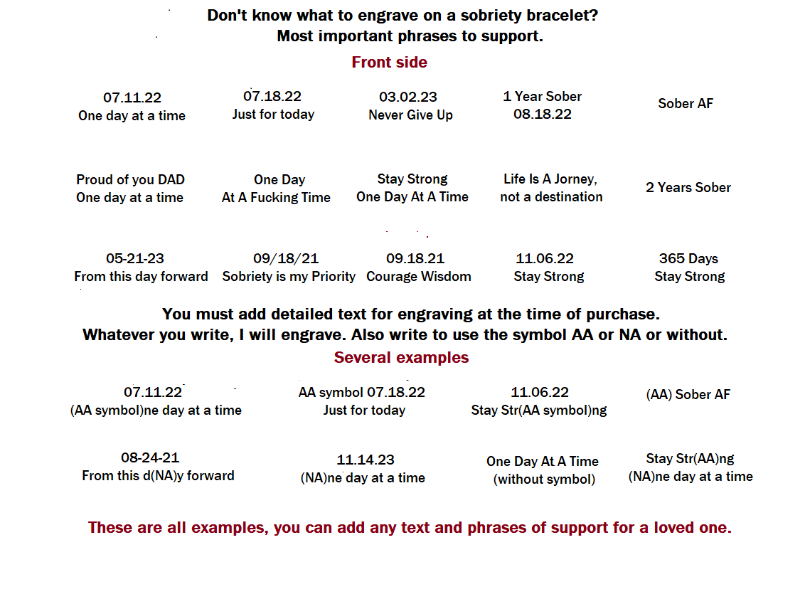 3. Add your any personalized text (describe your custom engraving detail - symbol AA or NA or without, date or without, phrase, quote etc.) Everything you write will be engraved.