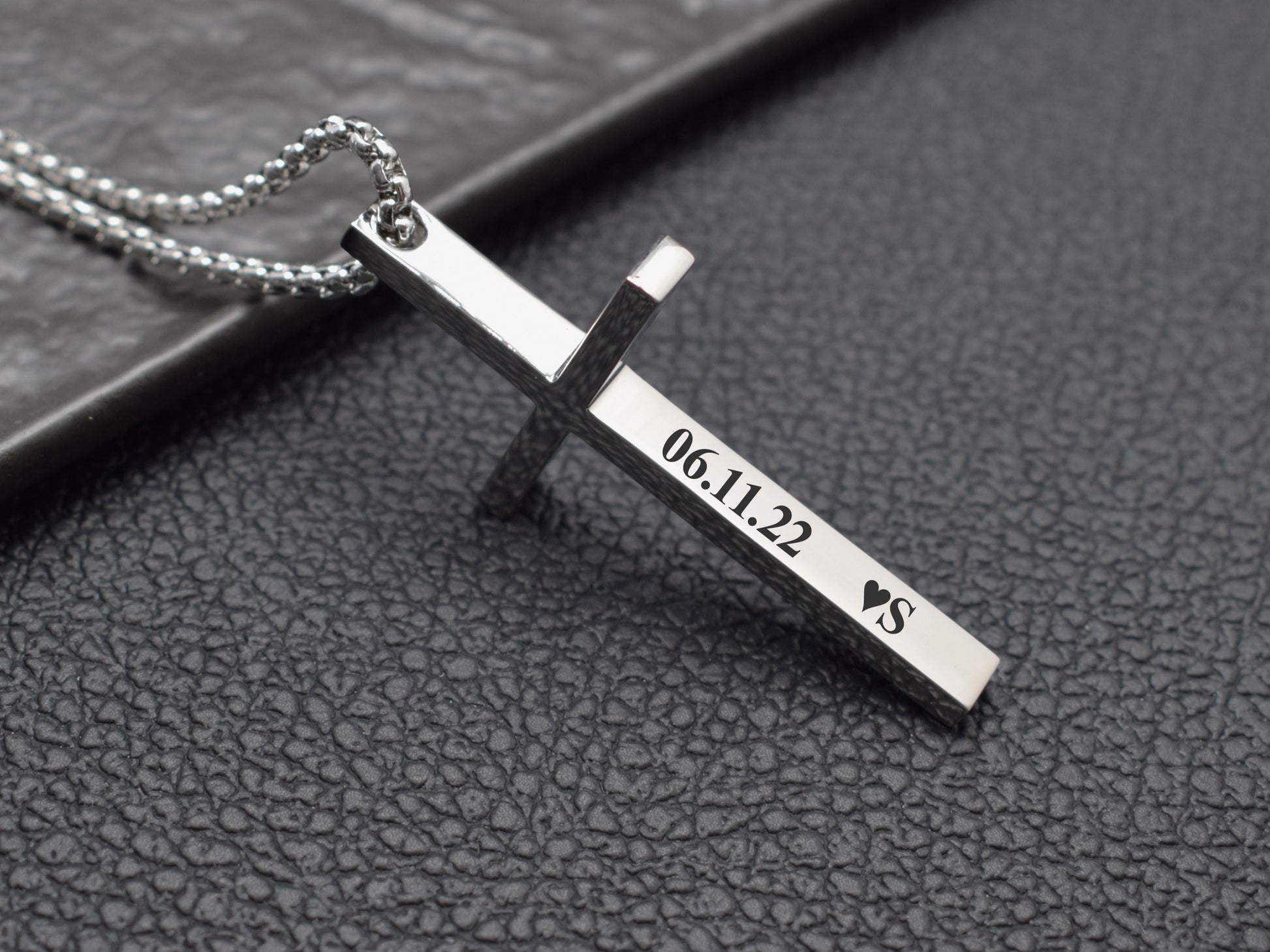 Silver Engraved Cross Necklace for Men Personalized Faith Jewelry