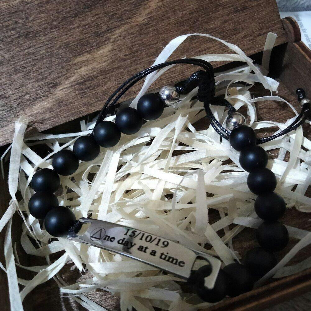 Unique sobriety bracelet is the perfect personalized sober gift with sobriety date and a phrase of support (one day at a time, one day at a fucking time, just for today, never give up, i believe in you, stay strong etc.). Customize your sober bracelet however you like.